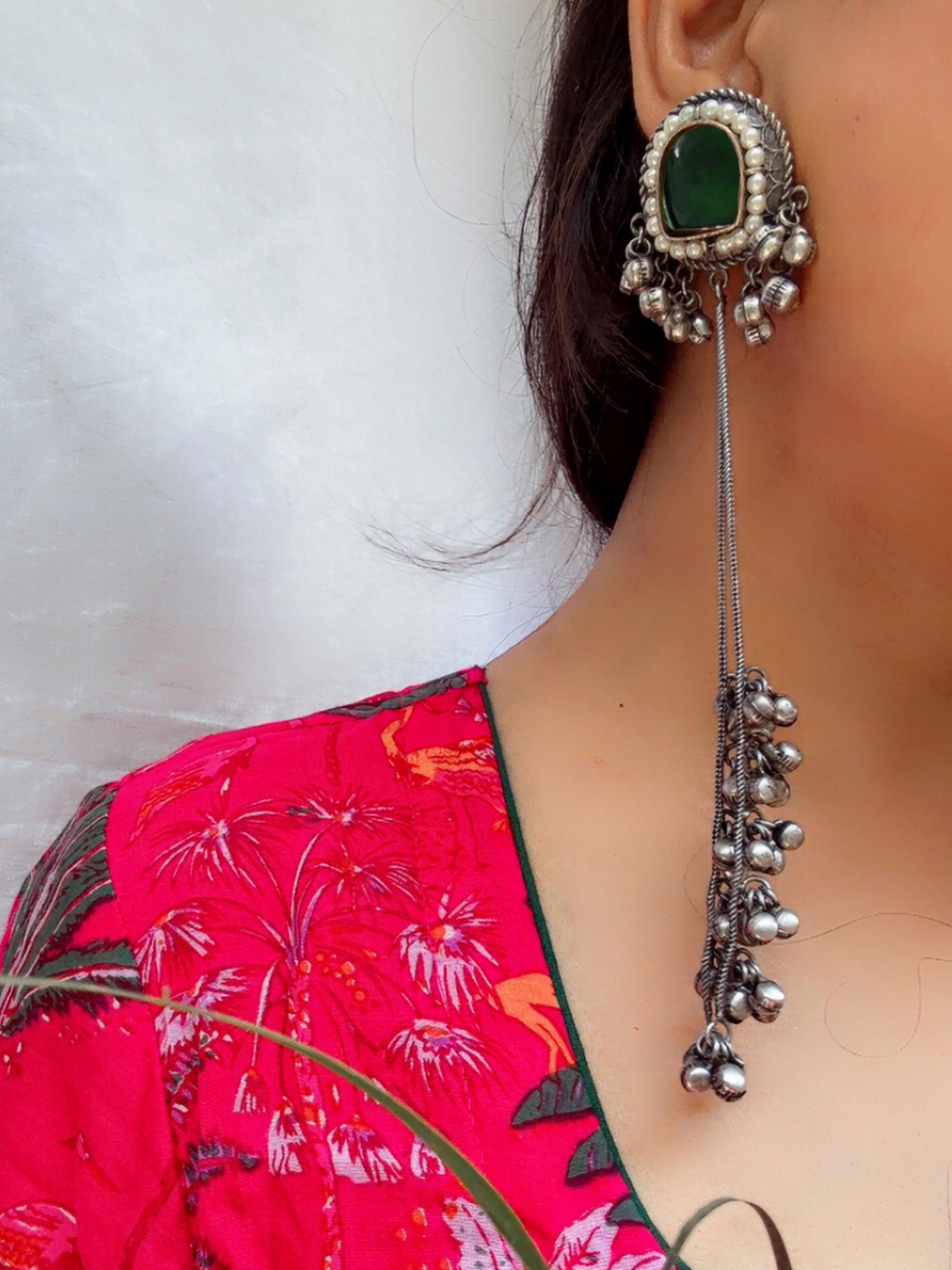 Aahna Green Pearl Monalisa Stone Super Long Ghungroo Earrings