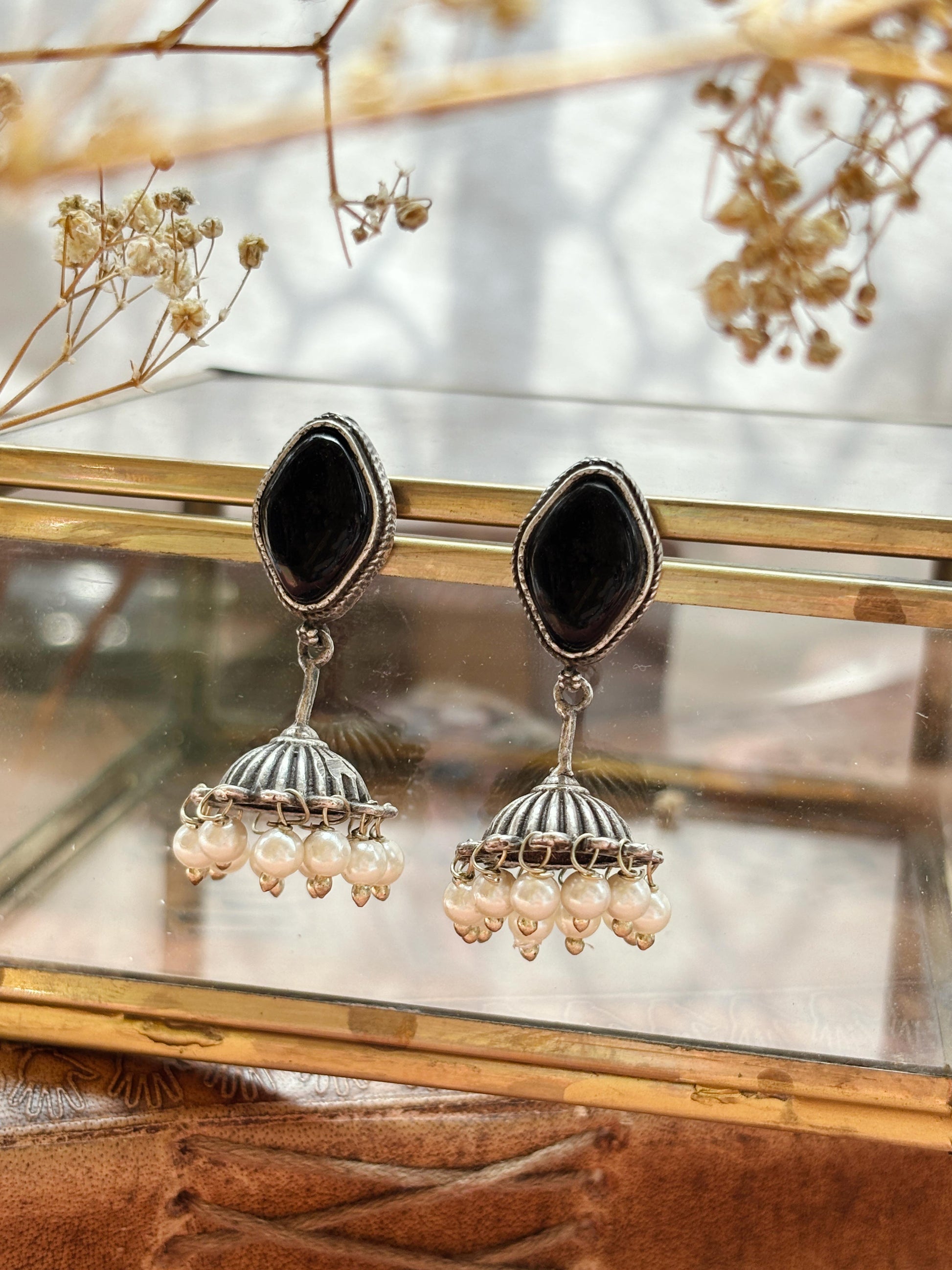 Product Description : Timeless, bold, and beautifully handcrafted, the Alpa Black Monalisa Stone Pearl Jhumki captures the essence of vintage Indian jewelry with a modern boho edge. Designed in brass with an oxidized silver finish, these earrings feature a striking black monalisa stone stud paired with a dome-shaped jhumki decorated with delicate pearl danglers. A perfect fusion of tribal artistry and antique aesthetics, this pair brings understated drama to any outfit.