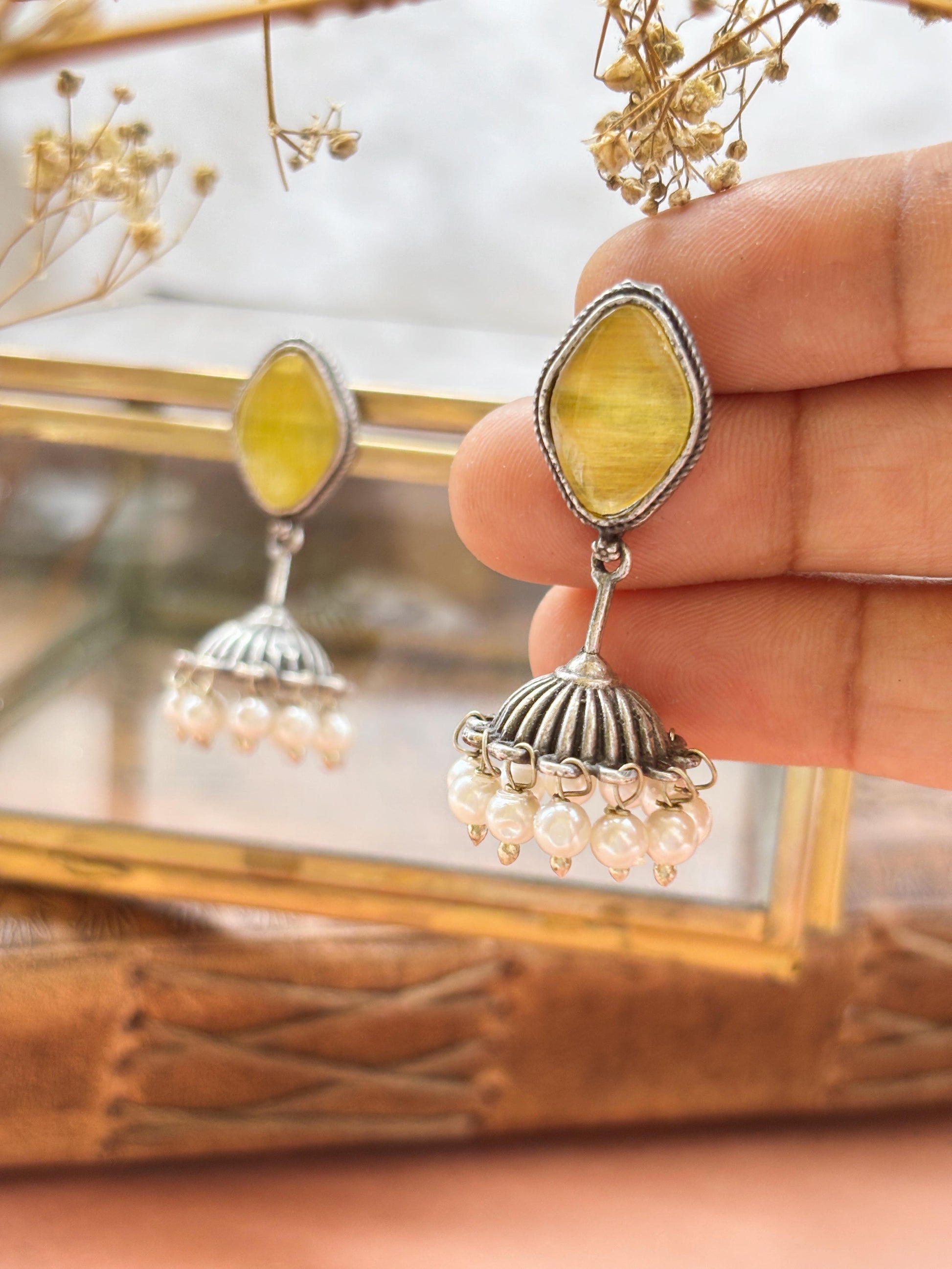 Product Description : Bright, delicate, and timeless – the Alpa Yellow Monalisa Stone Pearl Jhumki is designed to bring a pop of sunshine to your look. Crafted in brass with an oxidized silver finish, it features a glowing yellow monalisa stone stud paired with a dainty dome-shaped jhumki adorned with pearl drops. A fusion of tribal artistry and boho elegance, these earrings are perfect for everyday wear as well as festive occasions.