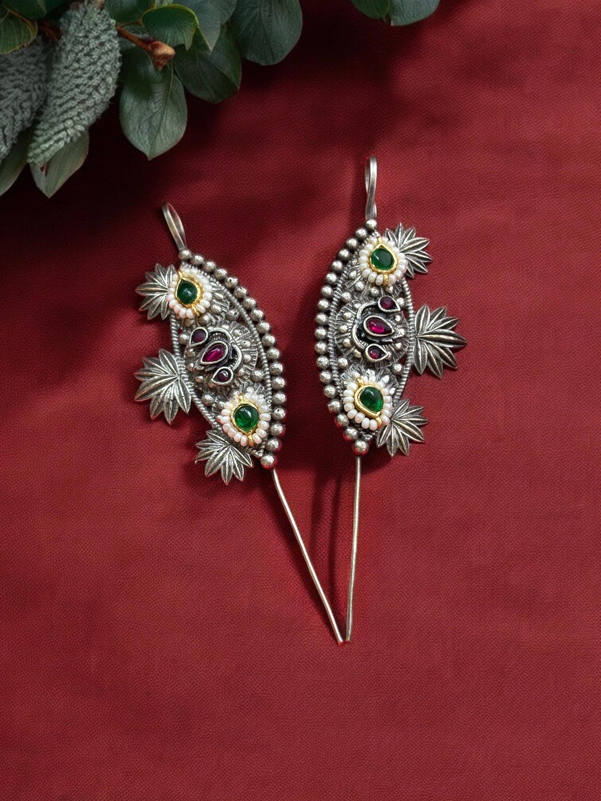 Product Description : Add a touch of regal charm with the Amoli Bugadi Kundan Sui Earcuffs, a perfect fusion of heritage and elegance. Crafted in oxidized brass with intricate detailing, these unique earcuffs feature a striking combination of red and green Kundan stones, framed with delicate beadwork and leaf motifs. The elongated sui-style hook pin design allows for a secure fit while exuding an antique tribal flair.