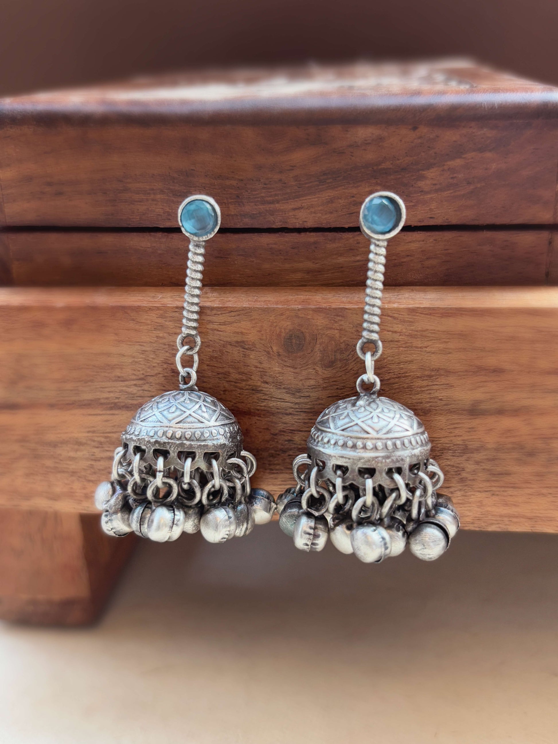 Anika Blue Monalisa Stone Ghungroo Jhumki – Oxidized Boho Silver Earrings