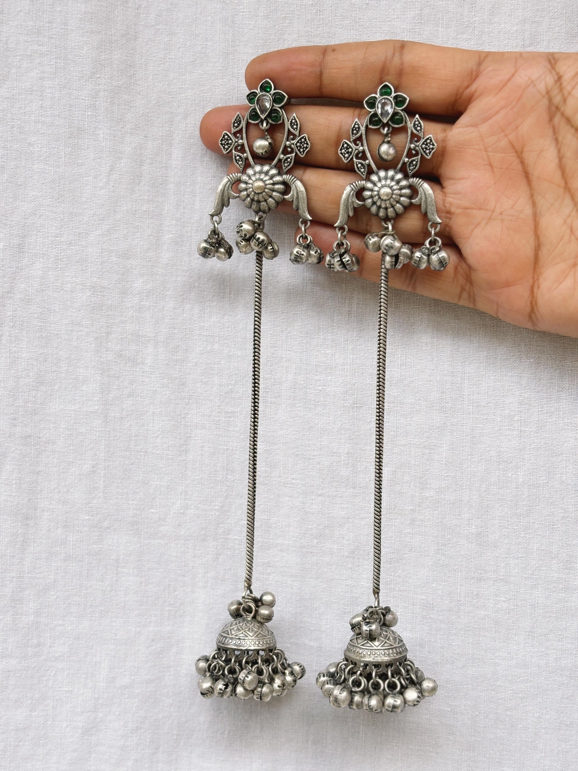 Product Description : Step into timeless elegance with the Anya Green Monalisa Stone Earrings, a perfect blend of Kashmiri heritage and boho charm. Crafted in brass with an oxidized silver finish, these earrings feature an ornate floral top inlaid with emerald-green Monalisa stones that radiate sophistication. The extended dangle chains, detailed carvings, and rhythmic ghungroo charms lead down to an intricately designed jhumka base, creating a captivating statement piece.