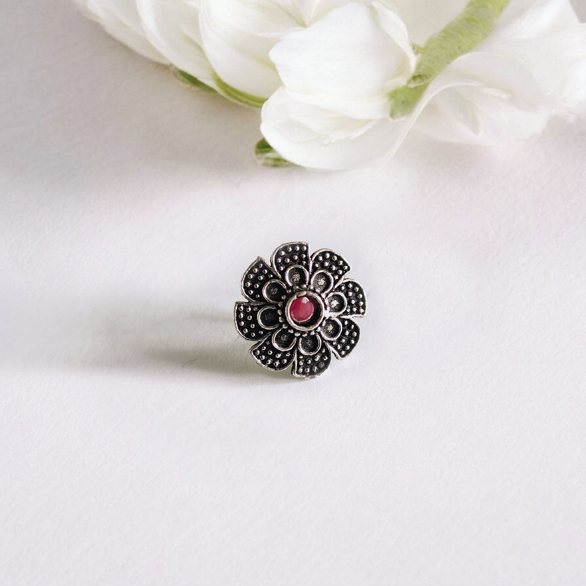 Product Description : Introducing the Chakai Red Monalisa Stone Piercing Nosepin—a beautifully handcrafted piece designed for lovers of ethnic and boho aesthetics. The brilliant red stone sits elegantly at the center, framed by oxidized brass detailing that gives it an old-silver, antique charm. Lightweight, comfortable, and incredibly stylish, this nosepin is perfect for everyday wear or to add a subtle festive sparkle to your look.