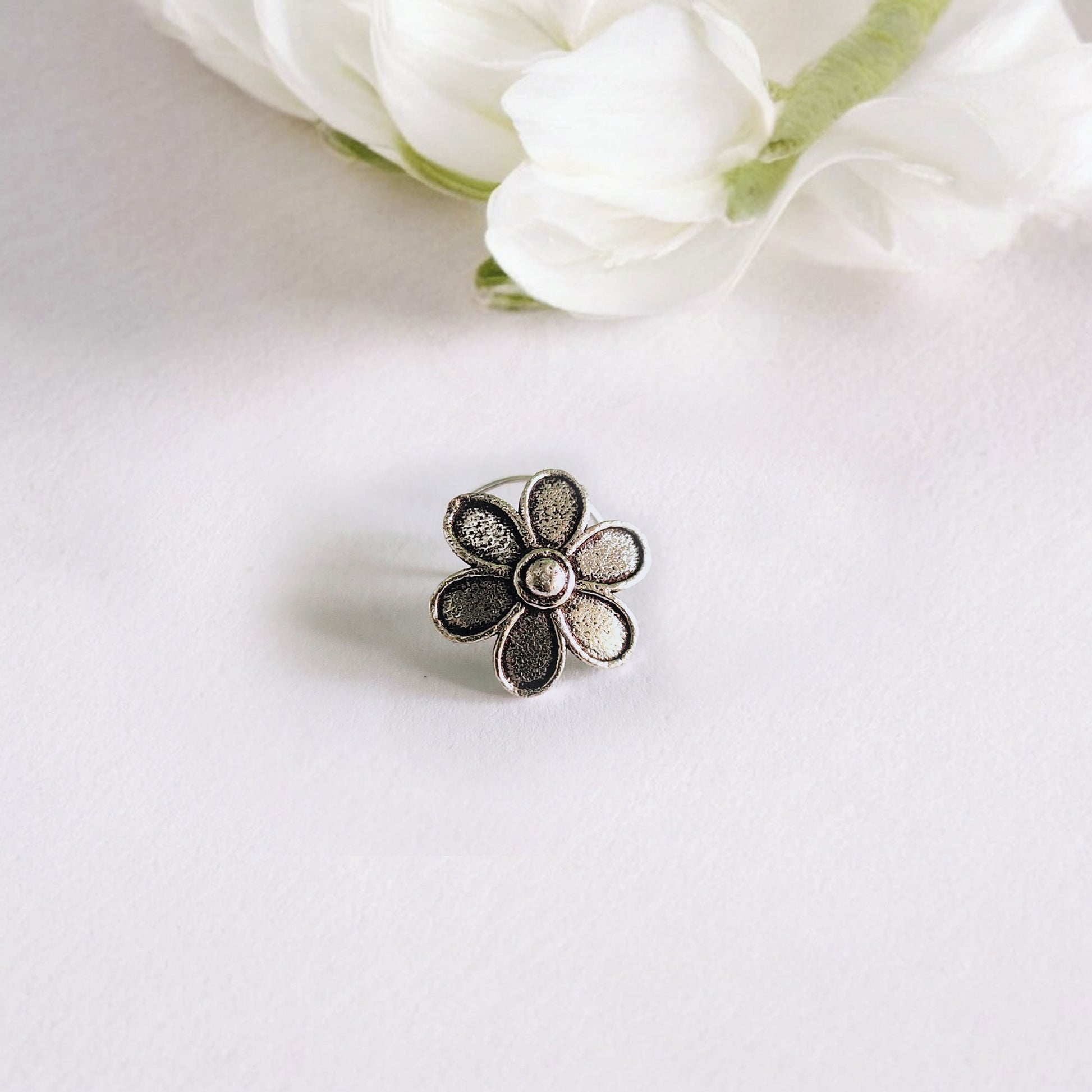 Product Description : Add a subtle yet striking touch to your everyday or festive looks with our Flower Piercing Oxidized Boho Nosepin. Handcrafted in brass with a detailed oxidized silver tone, this tribal-inspired piece celebrates minimal beauty and timeless tradition. Its petite floral design sits elegantly on the nose, making it perfect for those who love understated accessories with a hint of heritage. Lightweight, durable, and skin-friendly—this nosepin brings together comfort and effortless style.