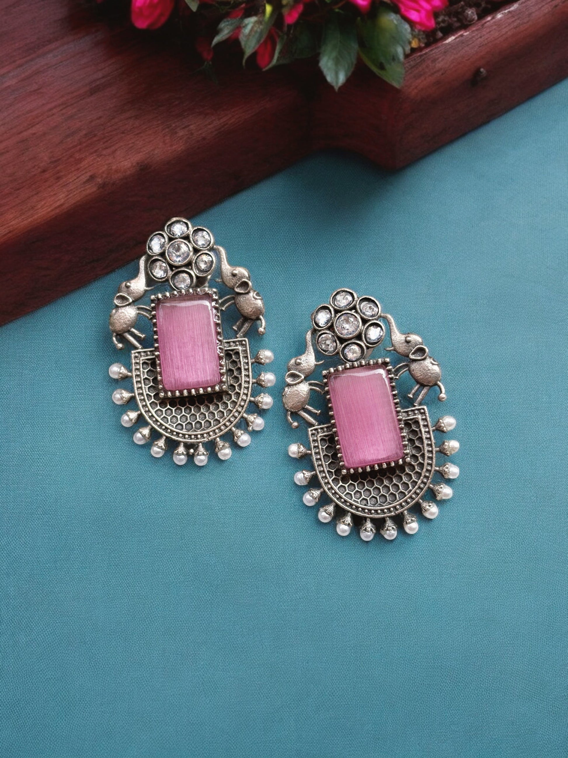 Product Description : Let your ears do the storytelling with Gajini—a stunning pair of oxidized earrings featuring majestic elephant motifs, delicately encrusted crystals, and a radiant pink Monalisa stone at the center. The traditional jali pattern base is framed with tiny faux pearl droplets, creating a balanced look of strength and elegance.