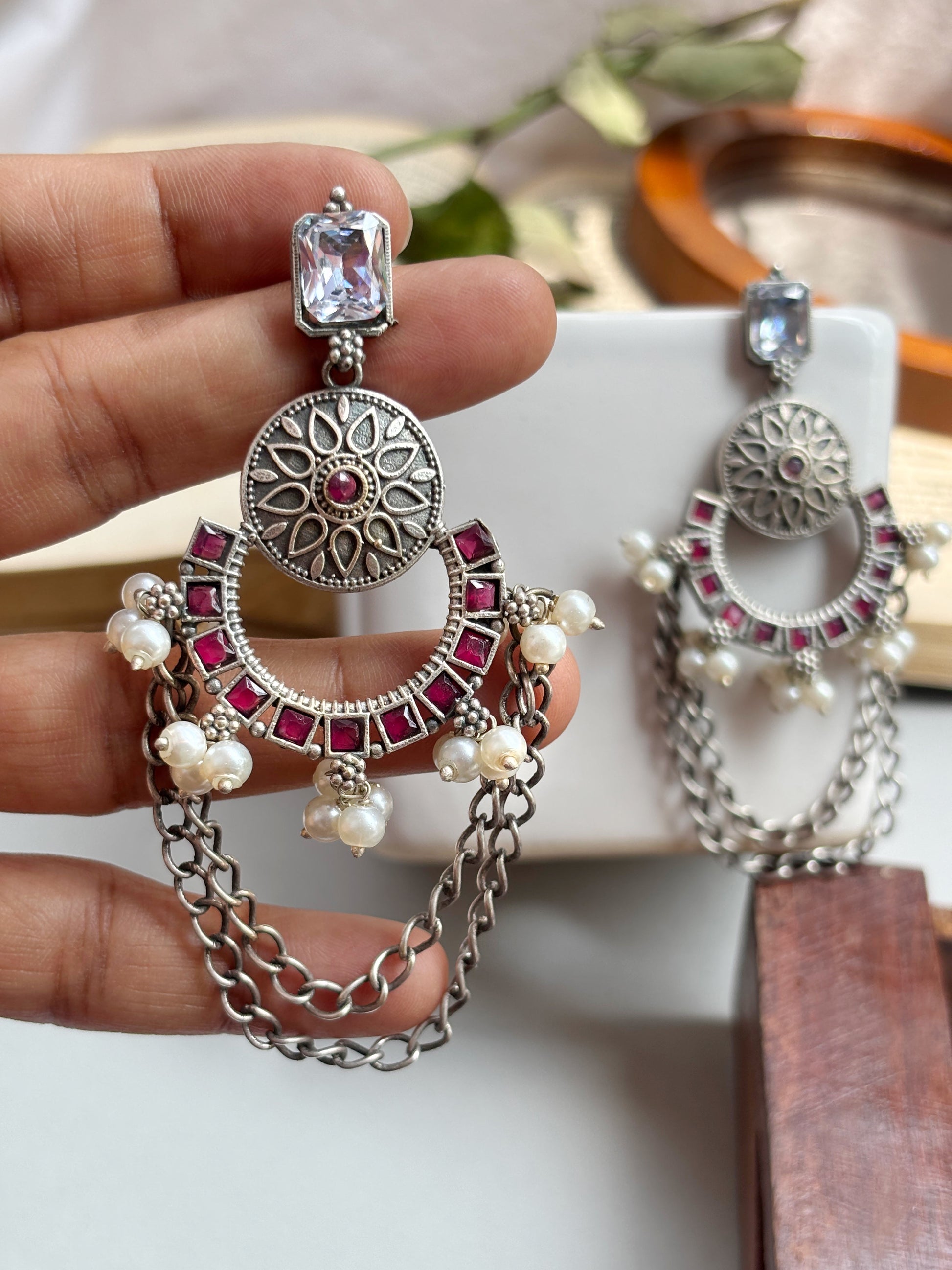 Heer Ruby Red Monalisa Stone Pearl Chain Dangle Earrings