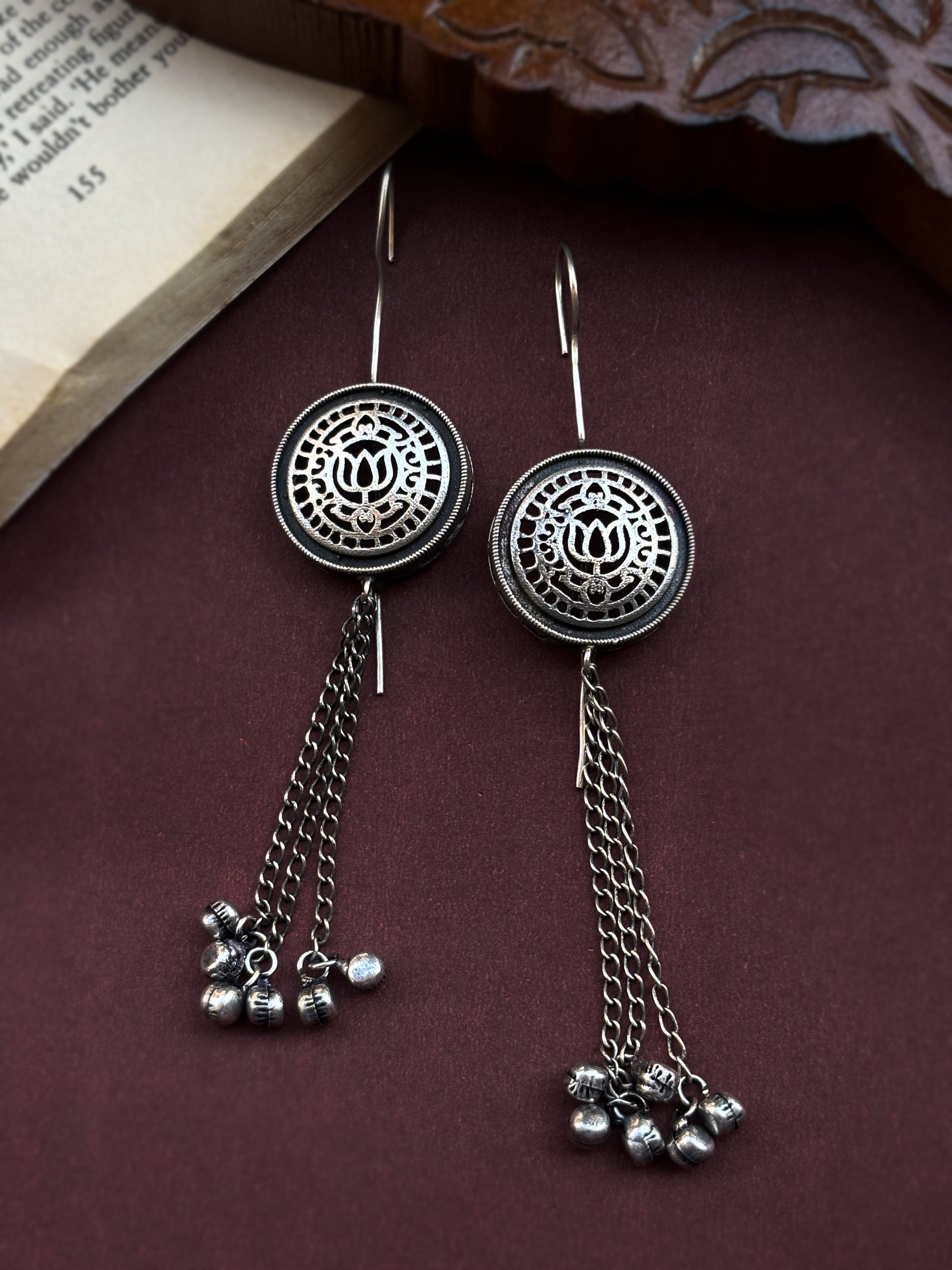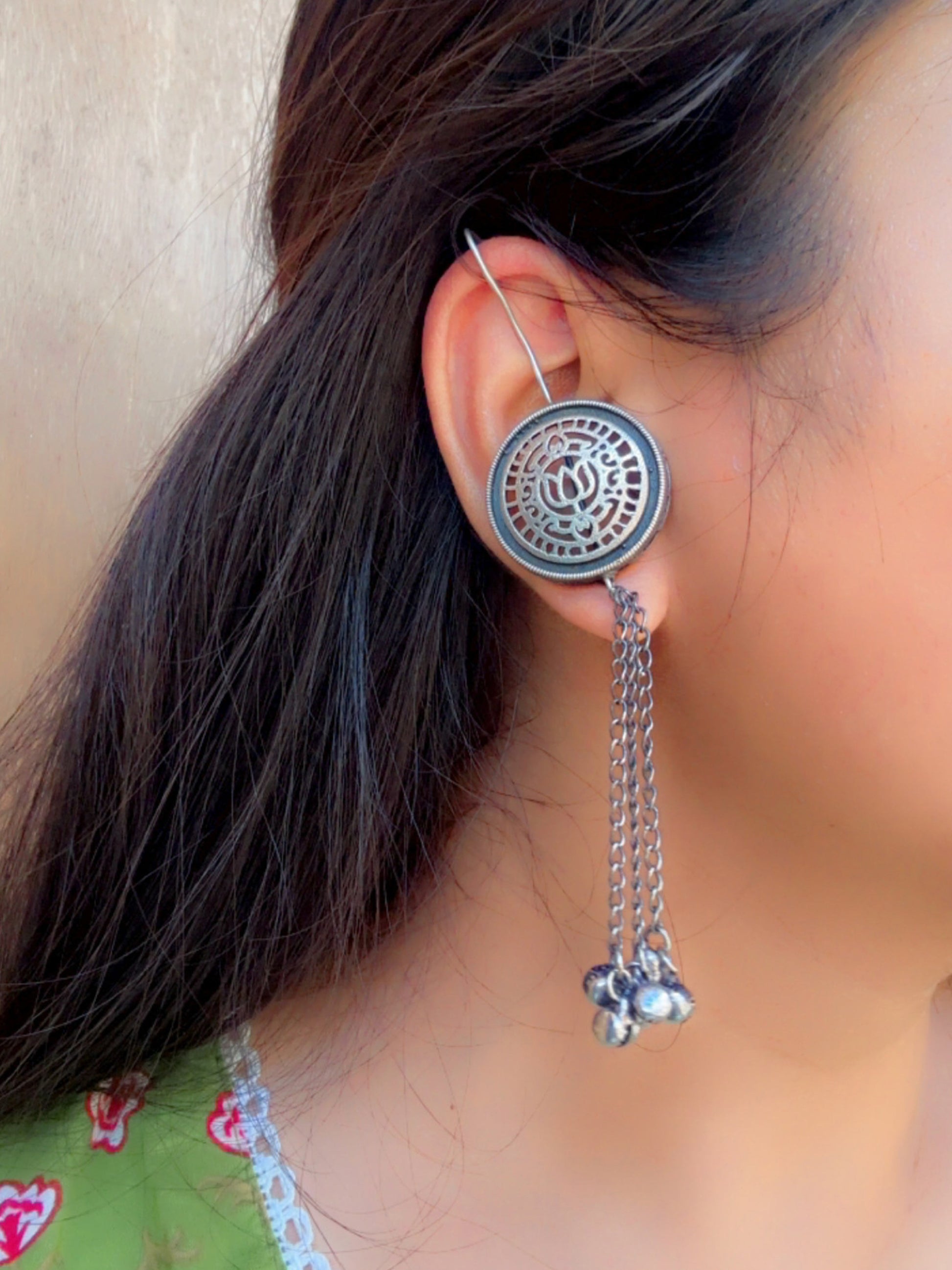 Product Description : A fusion of timeless artistry and rhythmic grace, the Jalaj Sui Ghungroo Earcuffs embody the spirit of movement and tradition. These oxidized silver-tone earrings feature a delicately carved lotus motif (Jalaj, meaning “born of water”), framed within a circular filigree medallion. Cascading metal chains end in tiny ghungroos, adding subtle sound and sway to every step.
