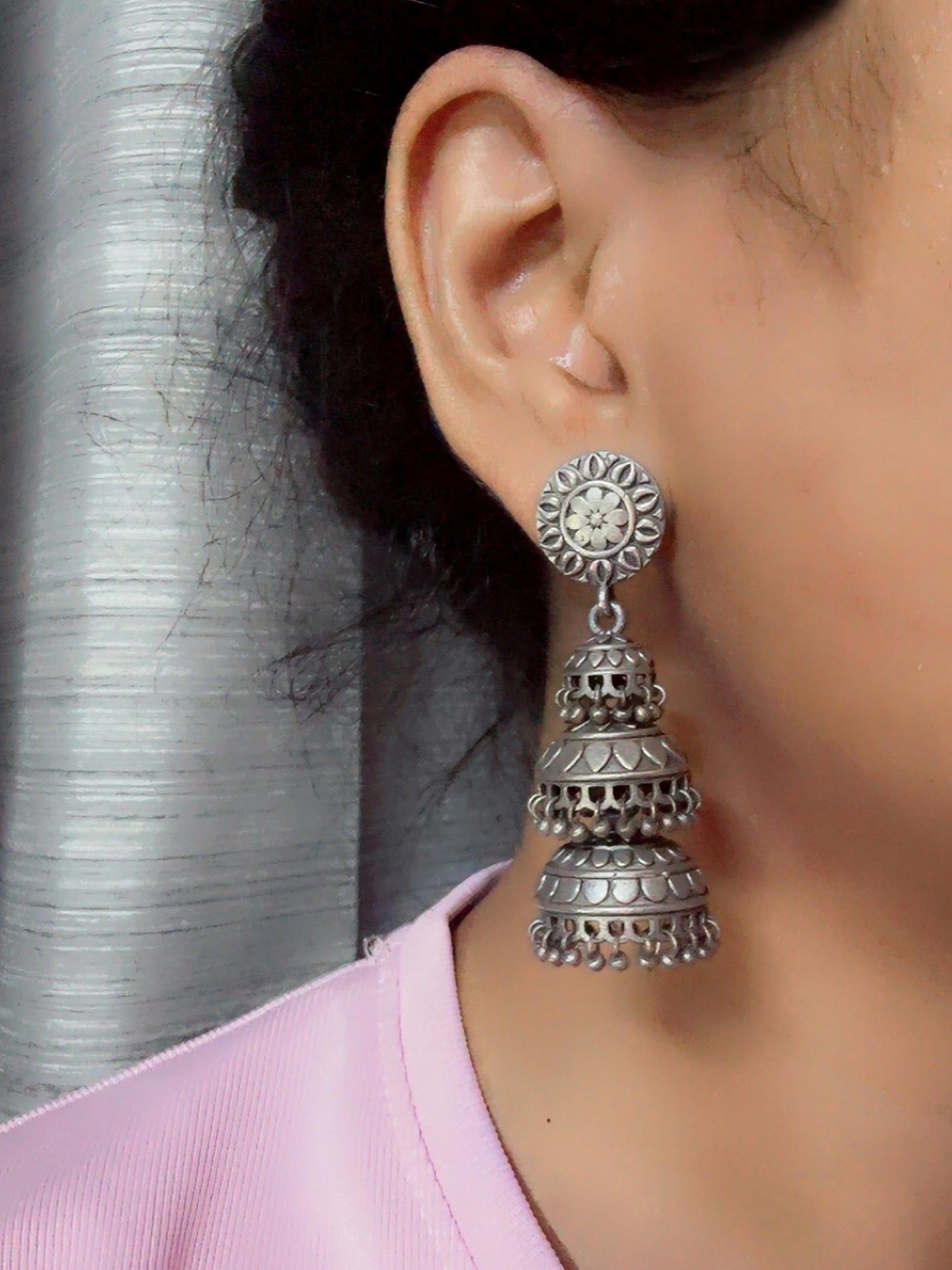 Product Description : Bring alive the charm of timeless tradition with the Jhoomar Triple Layer Ghungroo Jhumki Earrings. Handcrafted in brass with a silver-polished oxidized finish, these earrings feature a beautifully layered jhumki design, each tier adorned with intricate motifs and delicate ghungroo accents. Their vintage tribal charm makes them a perfect blend of heritage artistry and contemporary boho style.