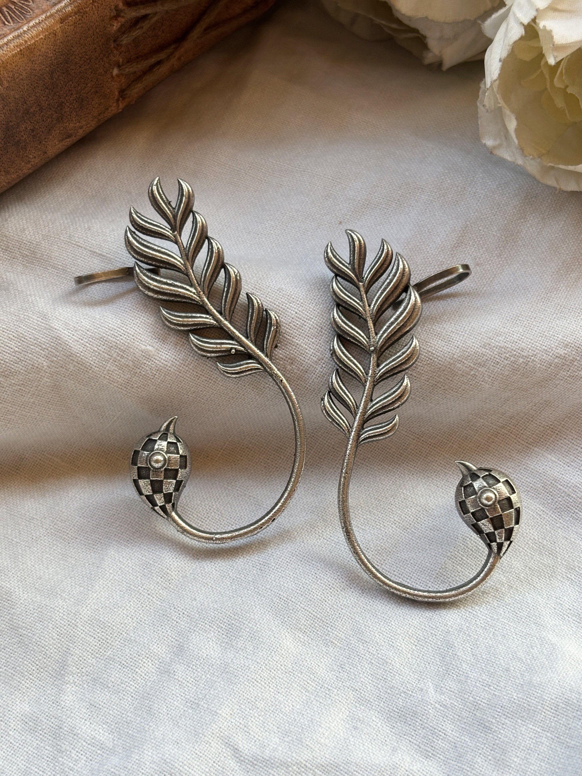 Product Description : Unconventional and striking, the Kalam Earcuff Studs blend earthy design with sculptural artistry. Inspired by the curves of calligraphy and organic leaf forms, these earcuffs wrap gracefully along the ear—adding drama without needing a piercing. The checkered bud detail at the curve’s end adds a subtle geometric intrigue, lending the piece a playful-yet-refined twist.