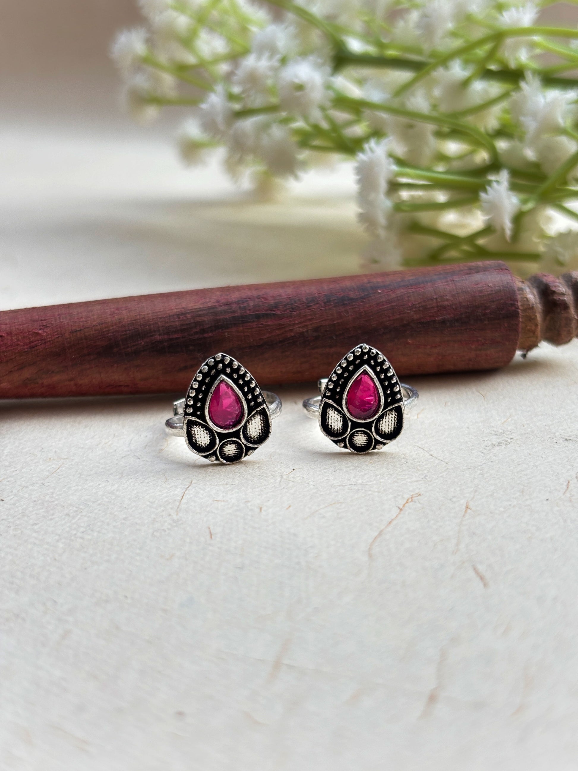 Product Description : Enhance your everyday and festive looks with our Kali Red Stone Adjustable Toe Rings. Crafted in high-quality brass with a silver-polished oxidized finish, this pair brings together timeless beauty and unmatched comfort.