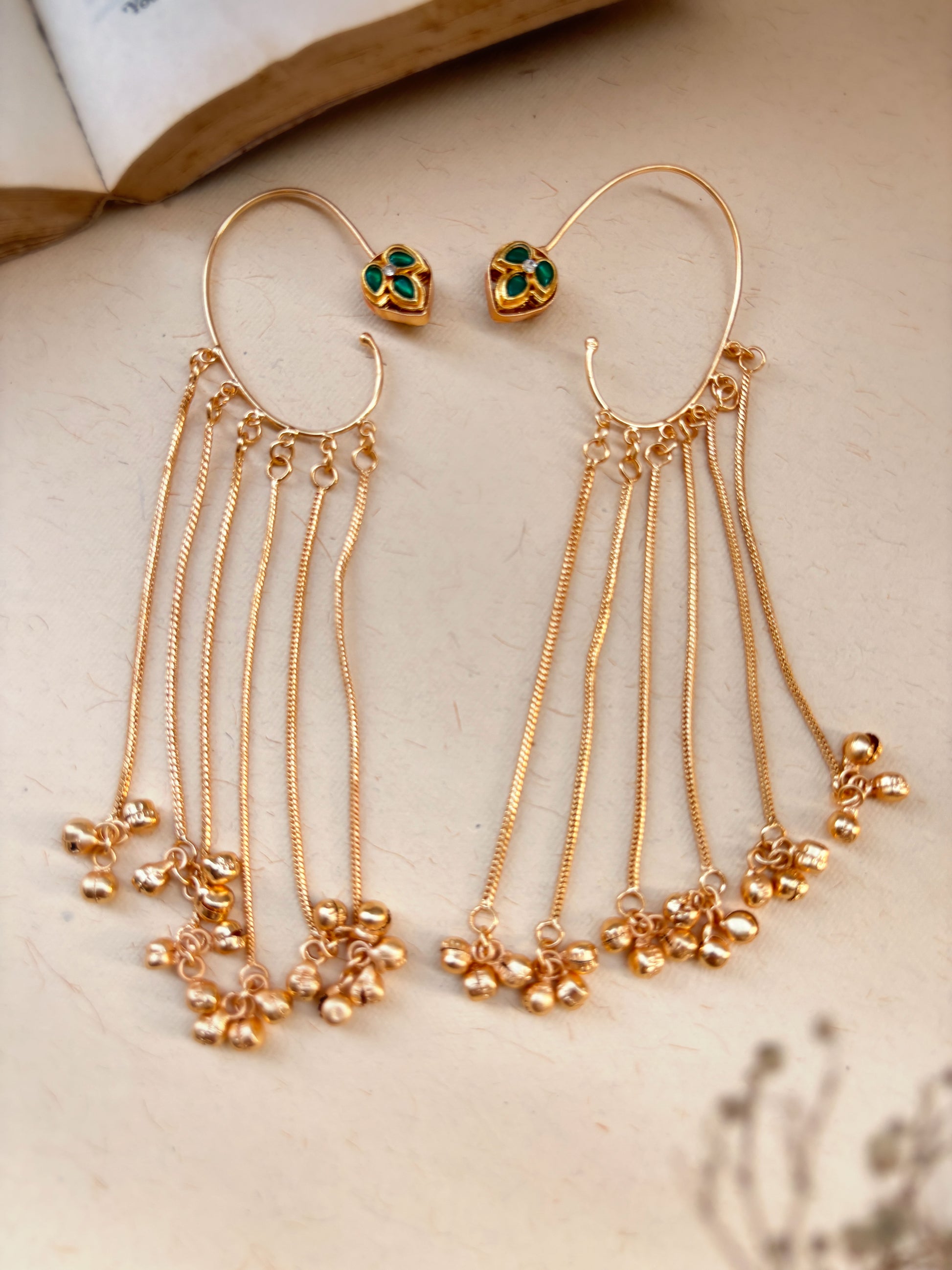 Product Description : Drawing inspiration from the opulent beauty of Kashmiri craftsmanship, these Karnapatra earcuffs embody the grace of traditional artistry blended with a modern festive allure. The delicate golden chains ending with tiny ghungroos create a melodious movement, while the green Monalisa stones bring a regal touch reminiscent of ancient royal jewels.