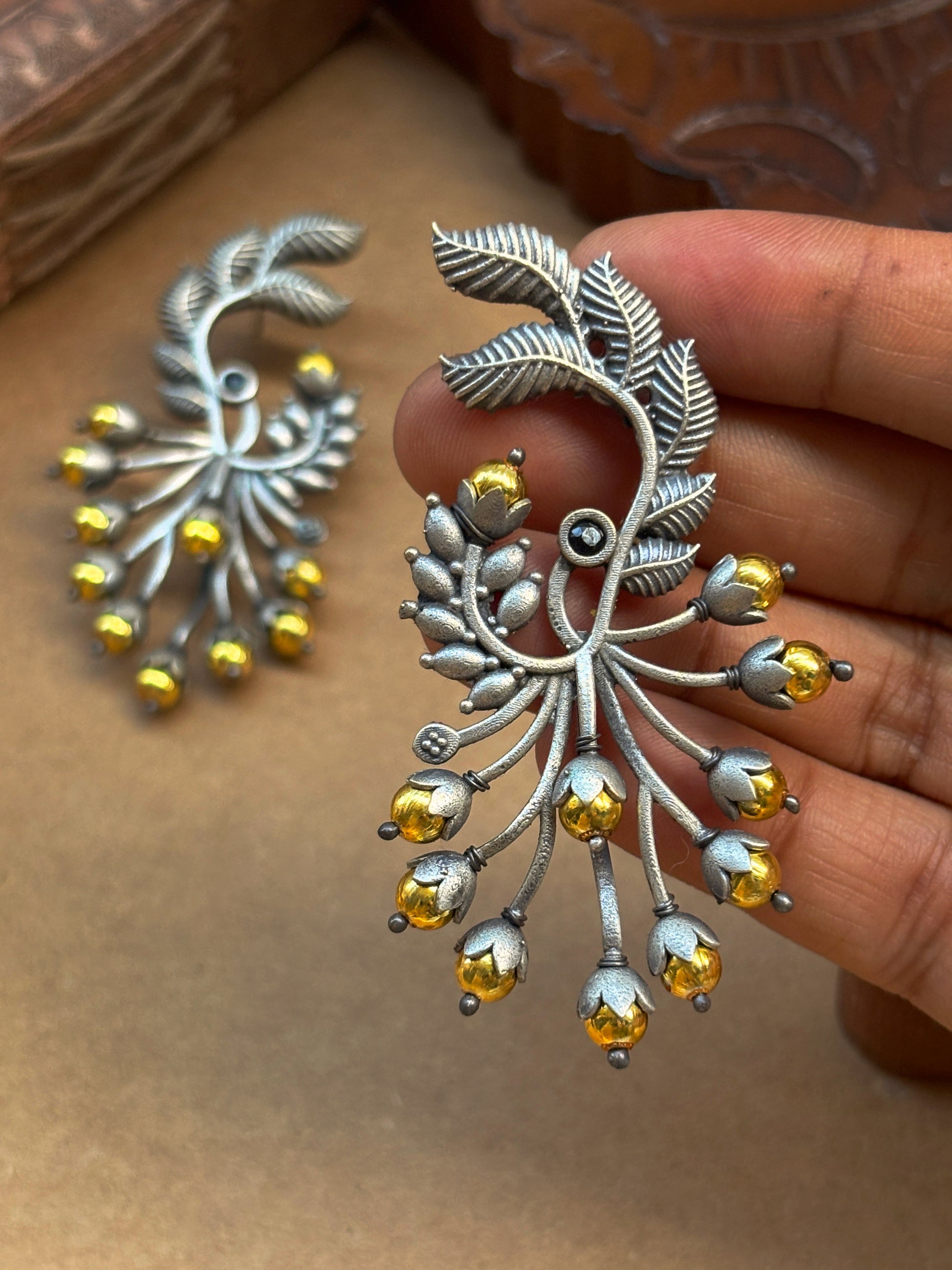 Product Description : Let your style bloom with grace in the exquisitely crafted Kashvi Dual Tone Studs, where antique artistry meets a modern bohemian soul. These stunning earrings feature a delicate bouquet of golden-hued buds blossoming from intricately detailed oxidized silver vines and leaves — a true celebration of nature’s elegance frozen in time.