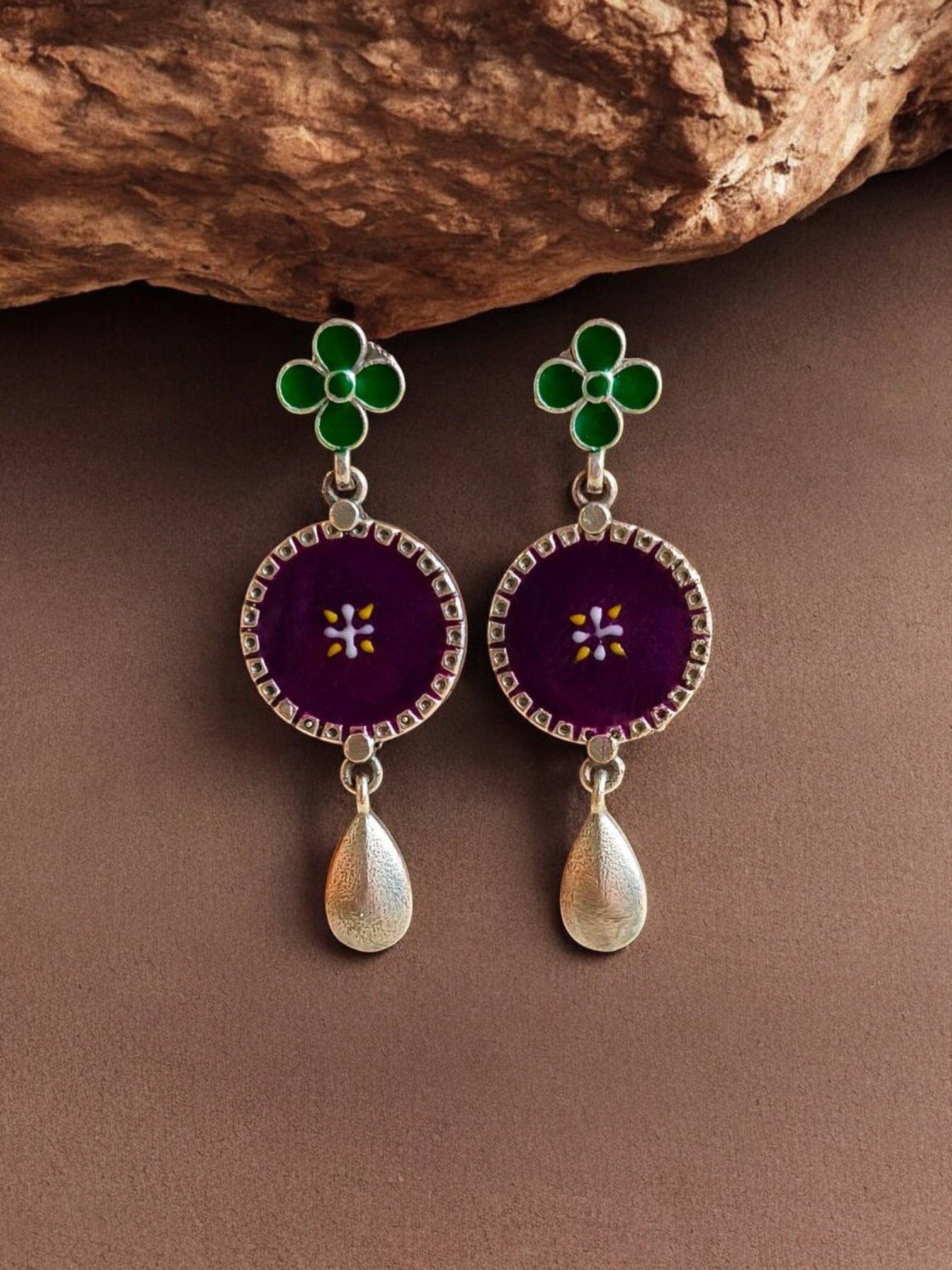 - Design: Floral stud with enamel disc and teardrop dangle