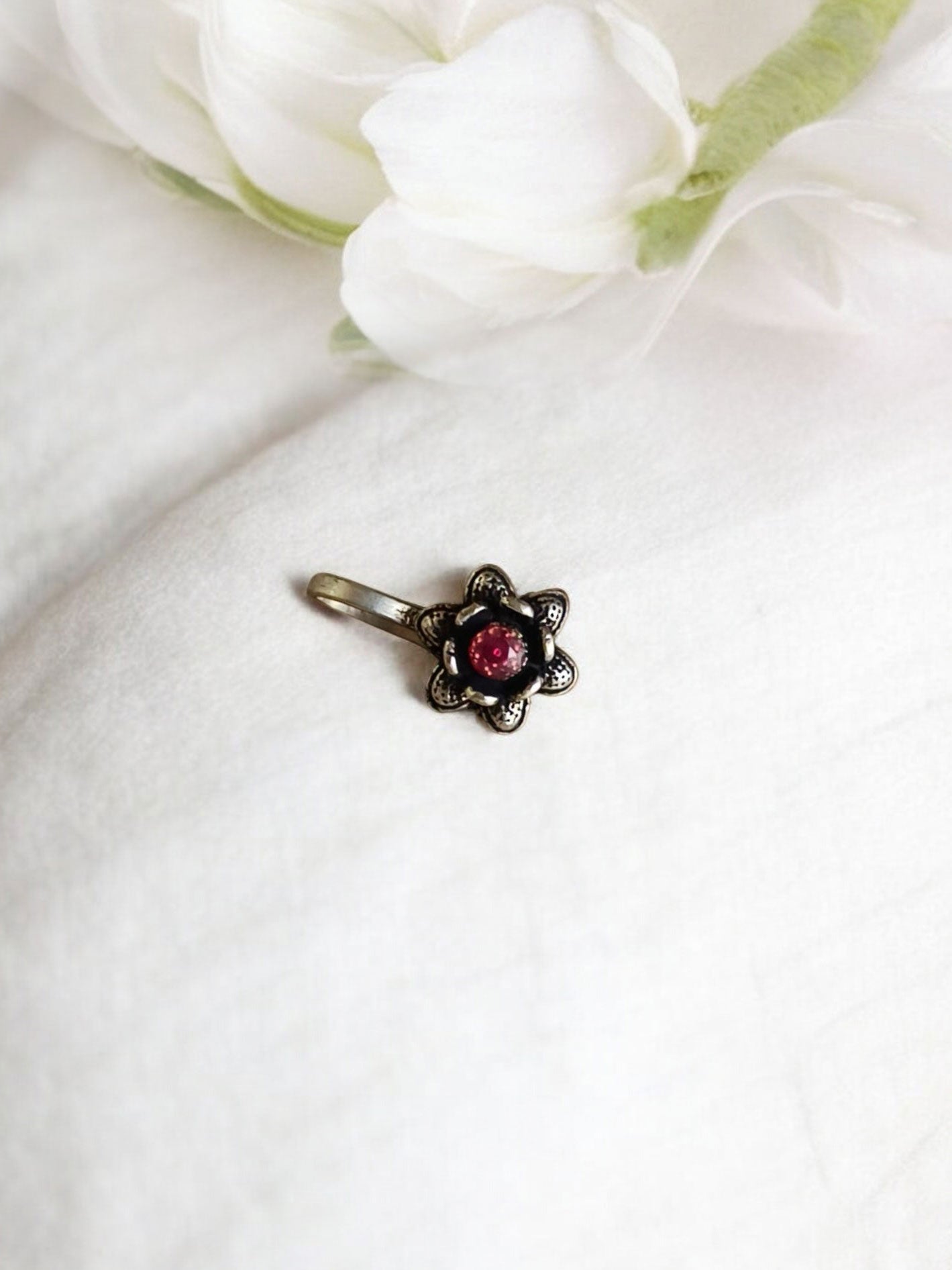 Design Inspiration: The Keya nosepin takes inspiration from timeless Indian tribal adornments where jewelry symbolized identity, strength, and heritage. Its floral silhouette celebrates nature’s pure beauty, while the deep red Monalisa stone represents passion, grounding energy, and elegance. Crafted in a vintage oxidized finish, this piece carries the charm of old-world craftsmanship blended with effortless modern wear |