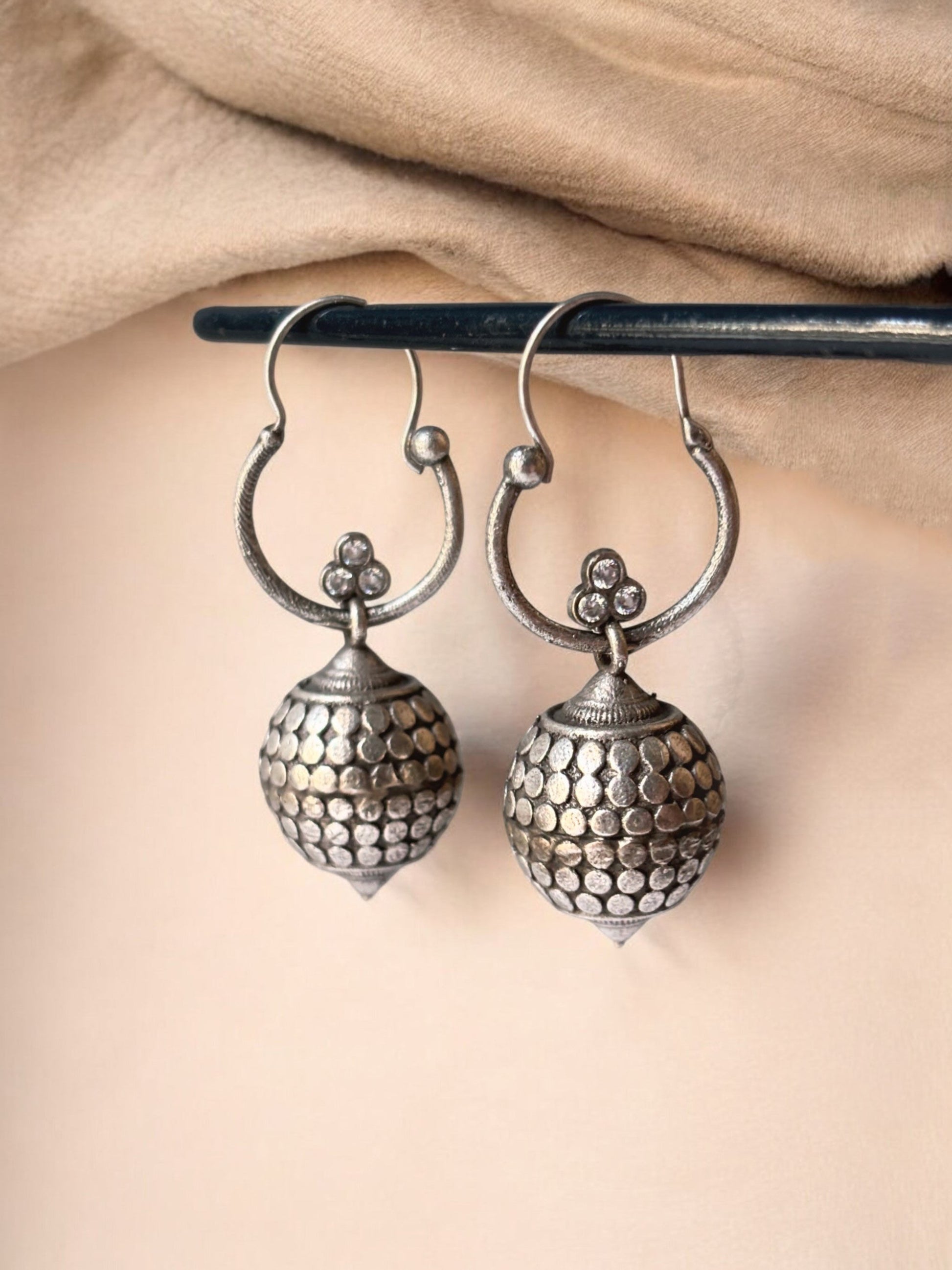 Product Description : Elevate your everyday with Kunda, a stunning pair of oxidized hoop earrings featuring a dome-shaped dangle at the base. Crafted in oxidized brass with antique silver plating, these balis fuse the classic hoop silhouette with detailed tribal textures. Lightweight yet statement-worthy, they are perfect for adding a vintage flair to both ethnic and fusion looks.