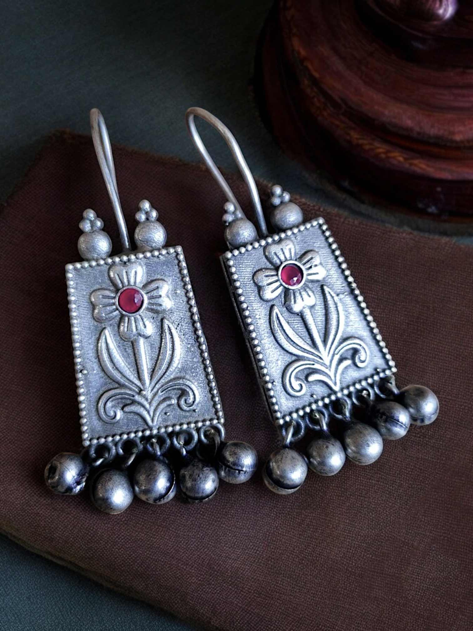 Product Description : Delicate yet bold, the Lipsa Hook Earrings celebrate rustic charm through their rectangular frame embossed with traditional floral motifs. A single red Monalisa stone at the center brings subtle vibrance, while the soft jingle of oxidized ghungroos adds a nostalgic touch to every movement. Whether you're dressing up for a cultural gathering or adding flair to your everyday ethnic wear, these earrings make a striking impression.