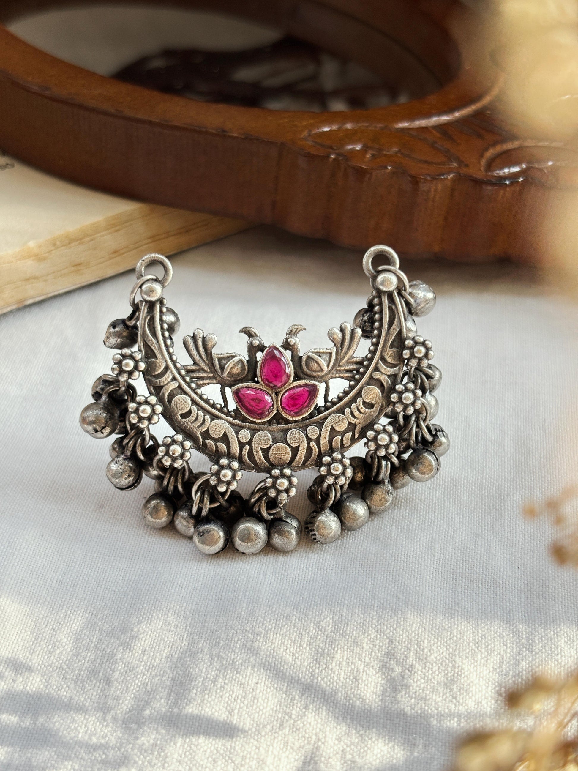 Product Description : Celebrate the beauty of vintage artistry with the Meet Red Magenta Ghungroo Ring, a bold boho statement piece crafted in oxidized brass. Designed with intricate floral engravings and traditional Kashmiri-inspired motifs, this ring features three red-magenta Monalisa stones at its center, symbolizing passion and vibrance. Surrounding the design are dangling silver ghungroos that create subtle movement, adding a rhythmic charm to your every gesture.