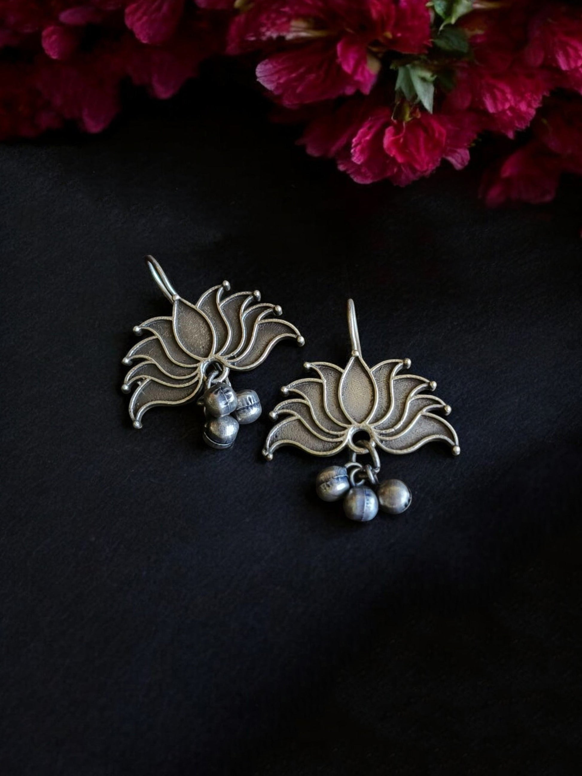 Product Description : Inspired by the quiet elegance of the lotus flower, the Niloufer Earrings bring a poetic charm to your everyday style. Crafted in oxidized silver-tone brass, the earrings bloom with a stylized lotus motif, delicately fanned out and finished with a trio of traditional ghungroos that chime softly with every movement.