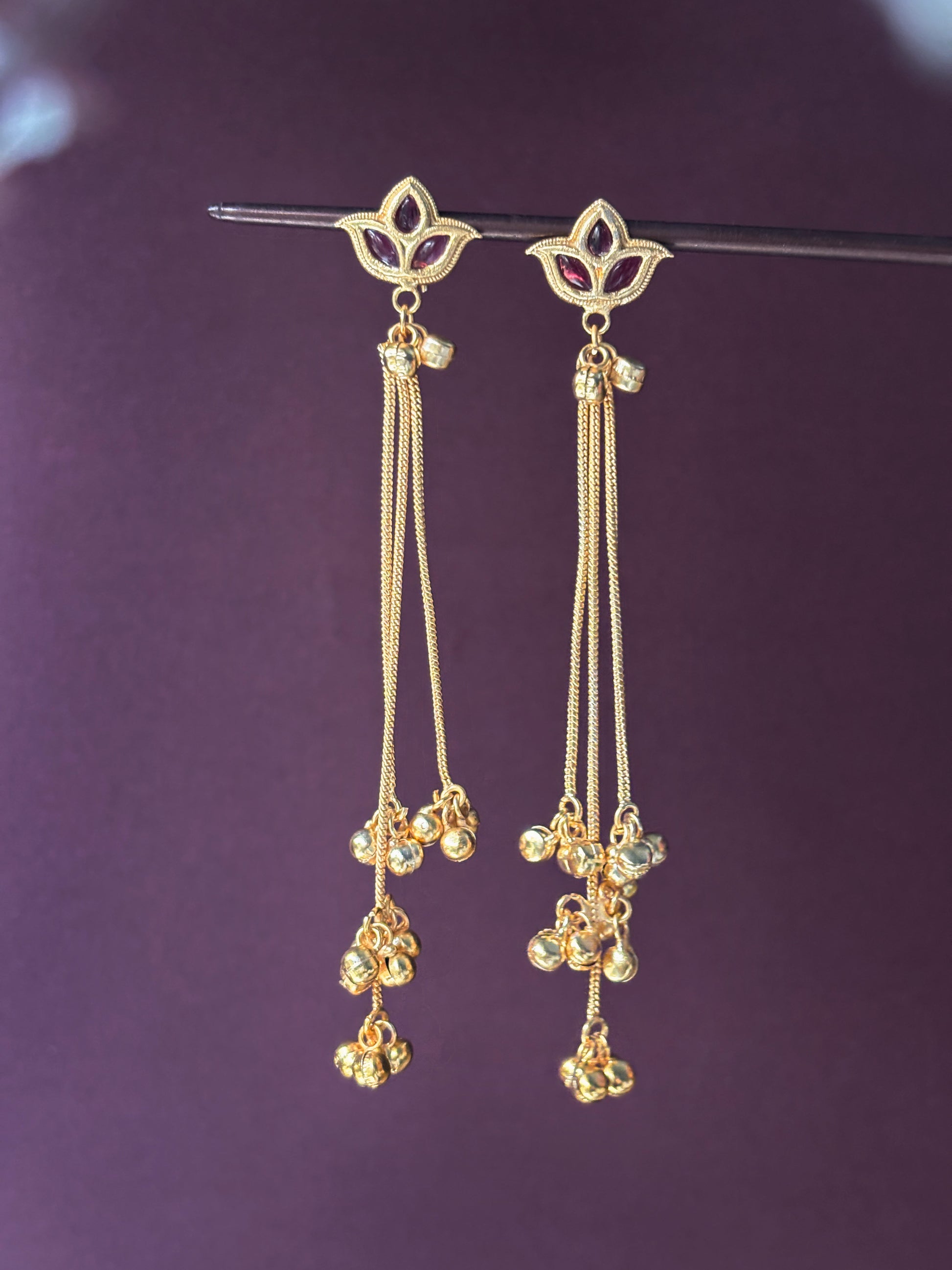| Design Inspiration: Inspired by the melodic essence of Raga and the ornate jewellery traditions of Kashmir, these earrings celebrate rhythm, grace, and expressive beauty. The leaf-inspired top motif adorned with deep red and magenta tones reflects classical Kashmiri artistry, while cascading ghungroo chains echo the musical movement found in traditional dance and festive adornment. |