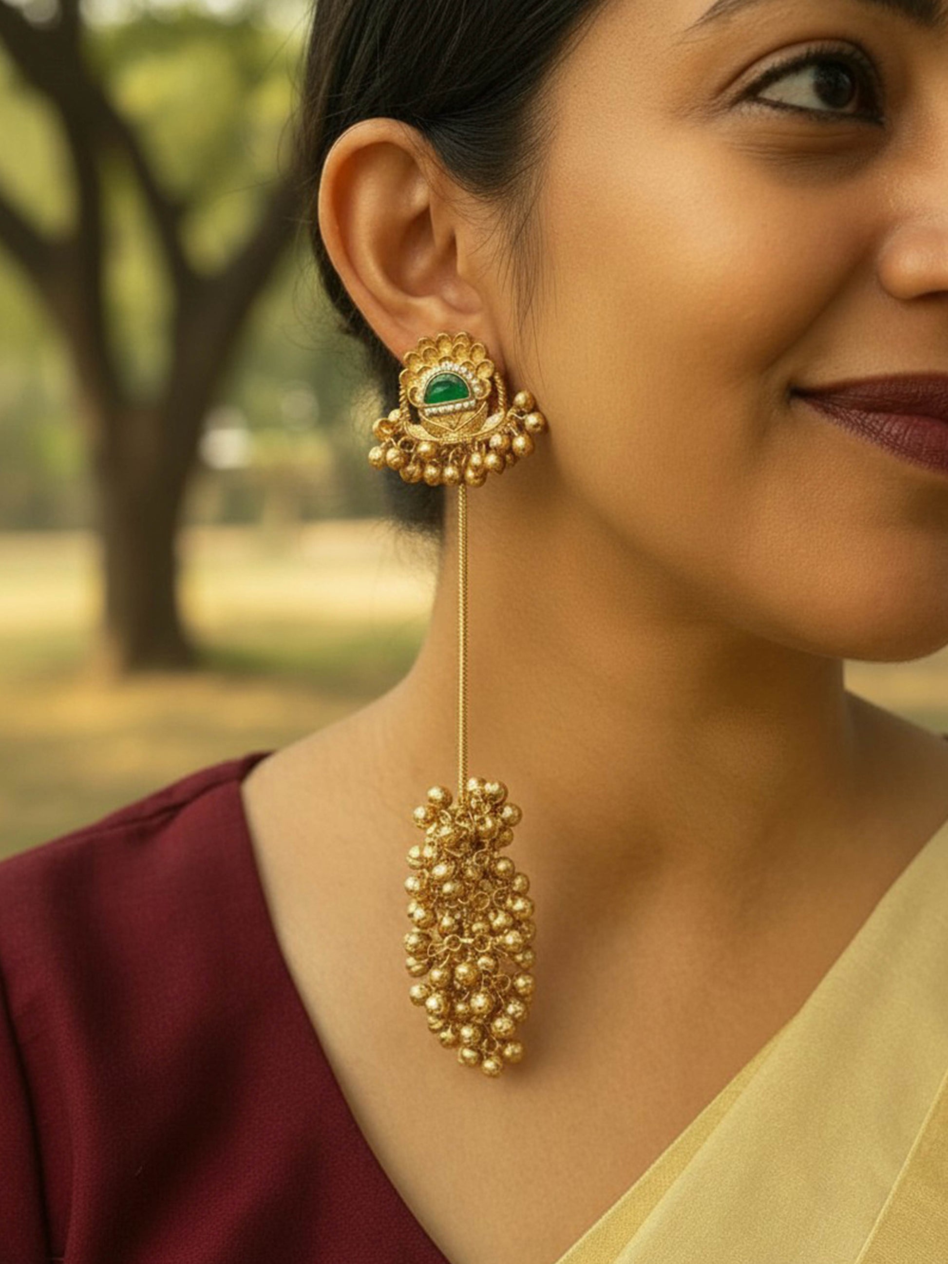 Design Inspiration: The Shikha Kashmiri Dejhoor Earrings draw inspiration from the timeless bridal jewellery of Kashmir, where elongated dangles symbolised elegance, grace, and heritage. The floral top paired with the luminous green Monalisa stone captures the charm of traditional Kashmiri craftsmanship, while the cascading golden ghungroos bring movement and festive radiance. |