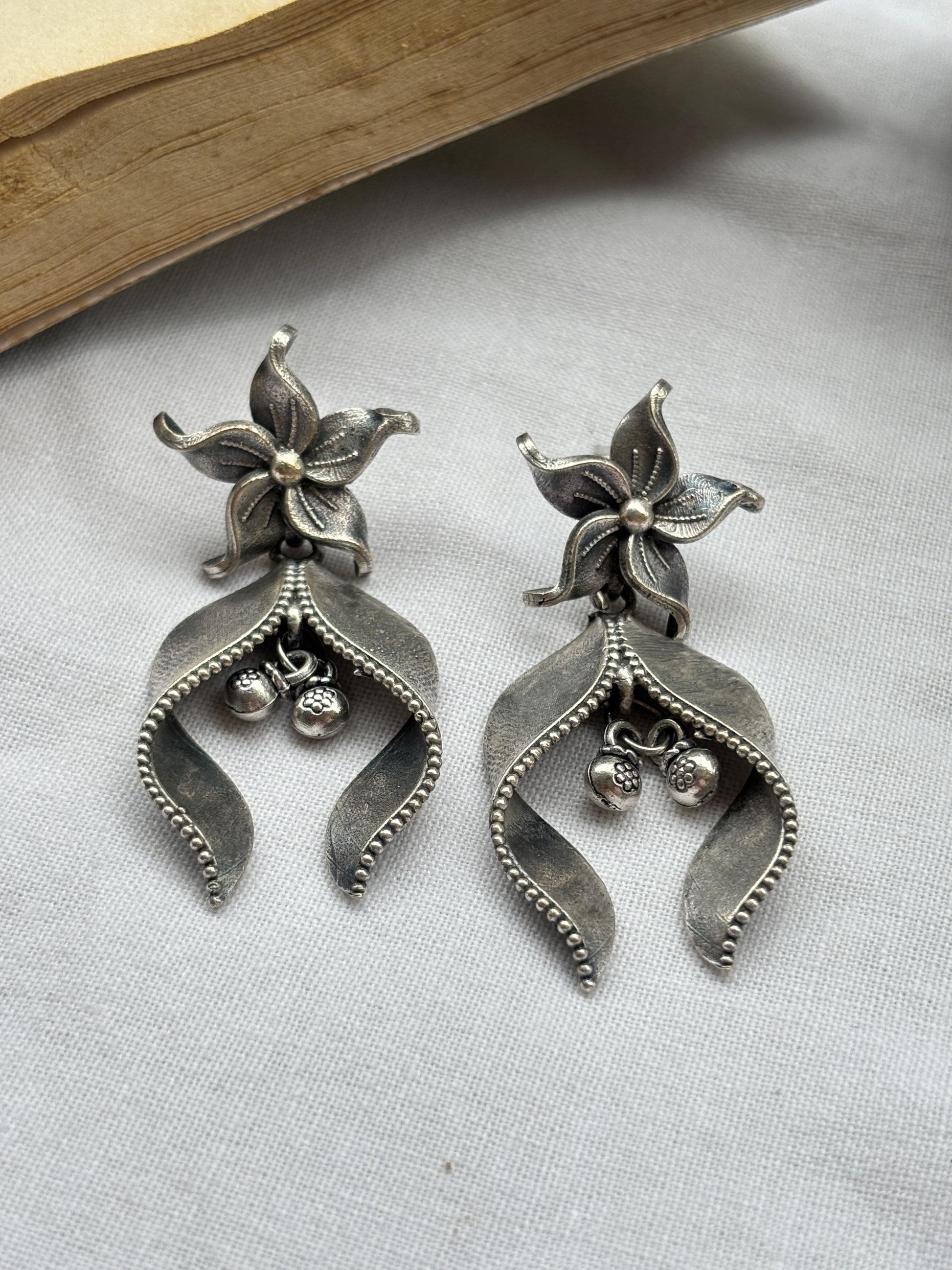 Product Description : Gracefully blooming with heritage, the Star Phool Earrings are a tribute to floral beauty captured in timeless metal. A five-petal flower motif crowns the design, with gently curving leaf-like elements that cradle a pair of soft-sounding ghungroos. Feminine, fierce, and finely detailed—these earrings are a celebration of slow craft and soulful elegance.