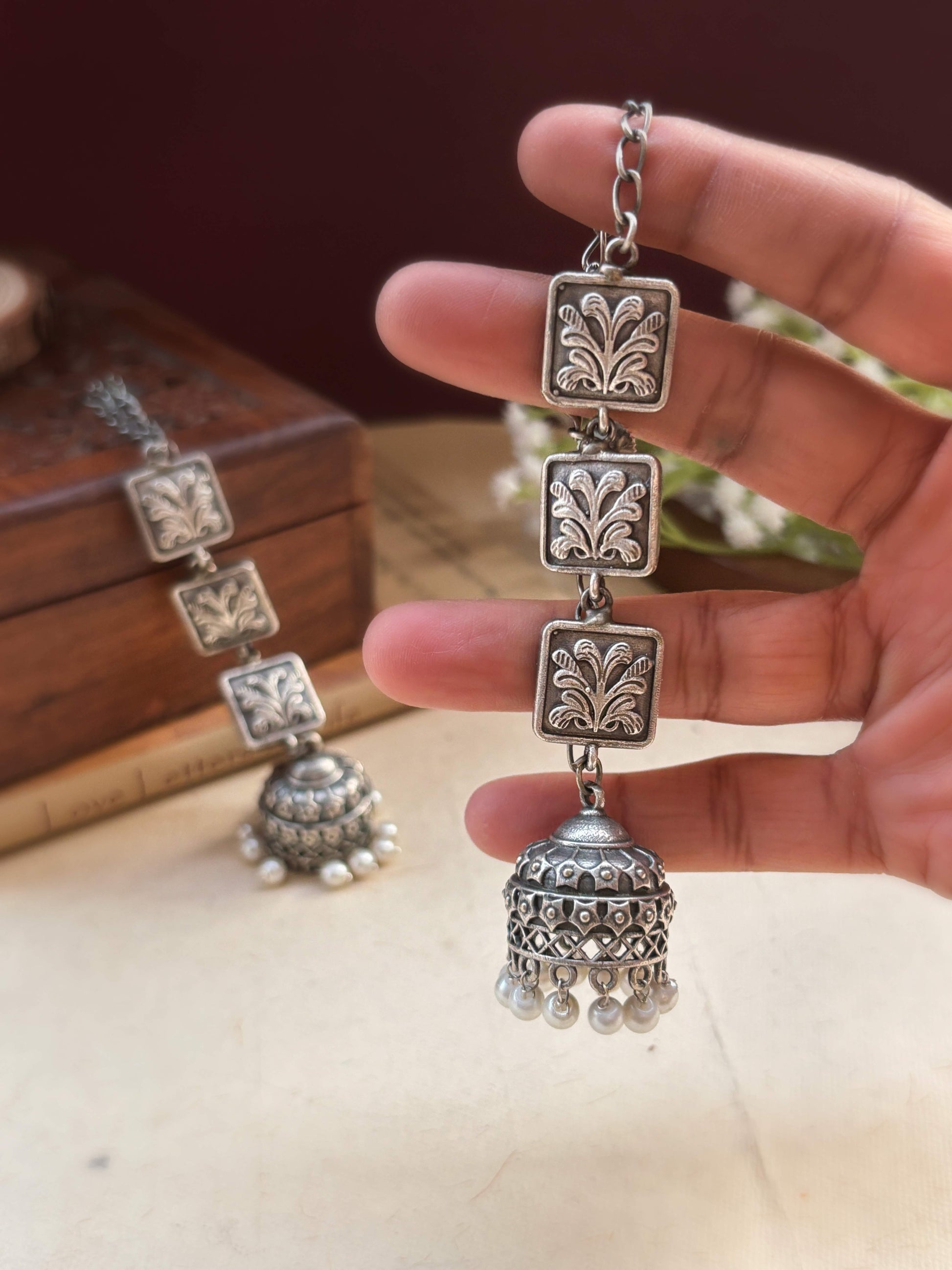 Each square element showcases intricate vintage-inspired engraving — a nod to old temple carvings, royal palaces, and handcrafted metalwork from traditional artisans. Finished with a beautifully engraved oxidized dome jhumka bordered with classic pearl droplets, this piece blends timeless artistry with a modern earcuff form. |