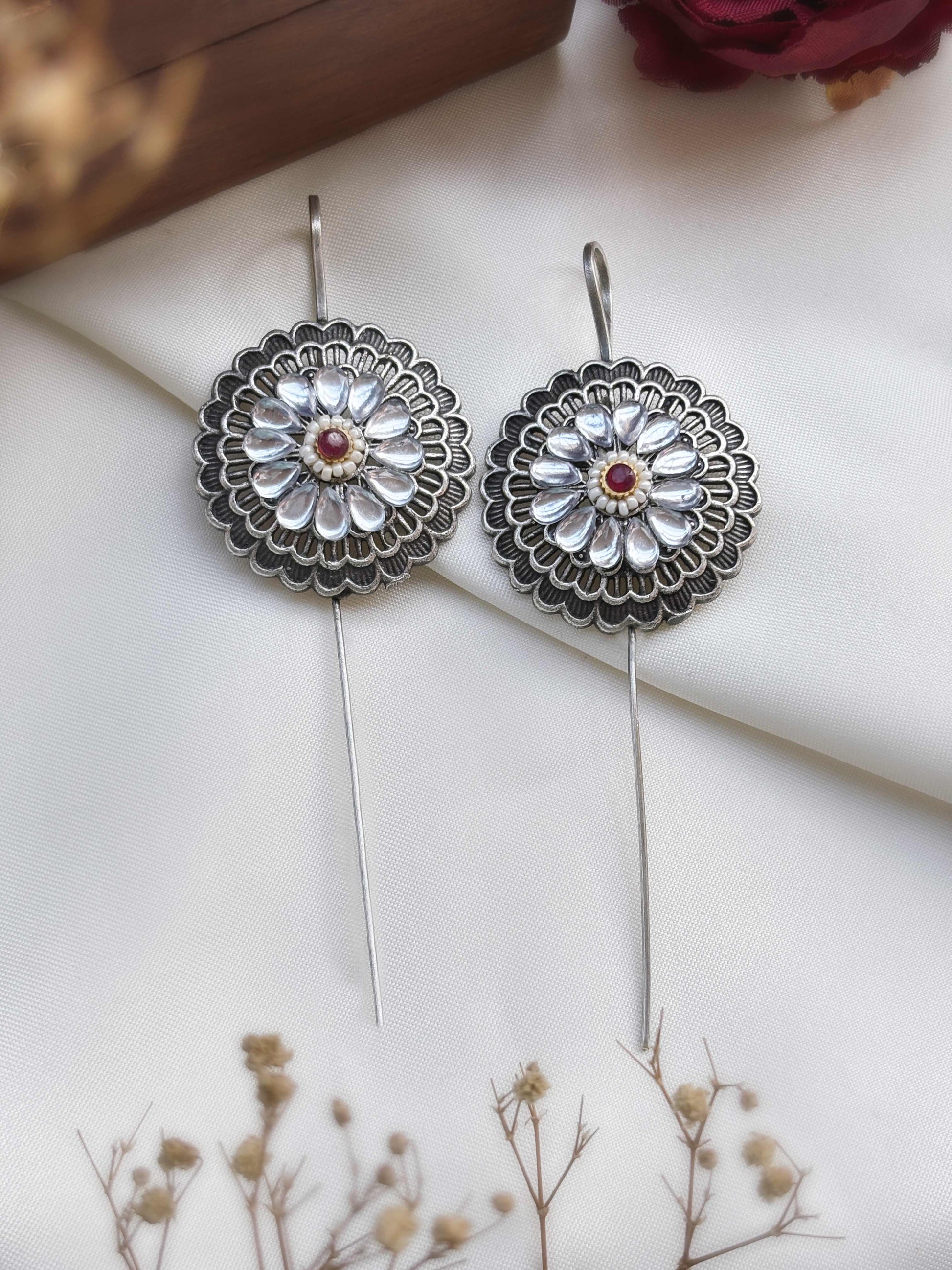Product Description : The Vanalika Sui Earcuffs are crafted in brass with an oxidized silver-replica finish, featuring a beautifully detailed floral centerpiece adorned with red Kundan stones and pearl highlights. Designed as clip-on Bugadi earcuffs, these earrings sit gracefully along the ear, offering a traditional look without the need for piercings. Elegant yet distinctive, they are perfect for those who love heritage jewellery with a refined, artistic touch.