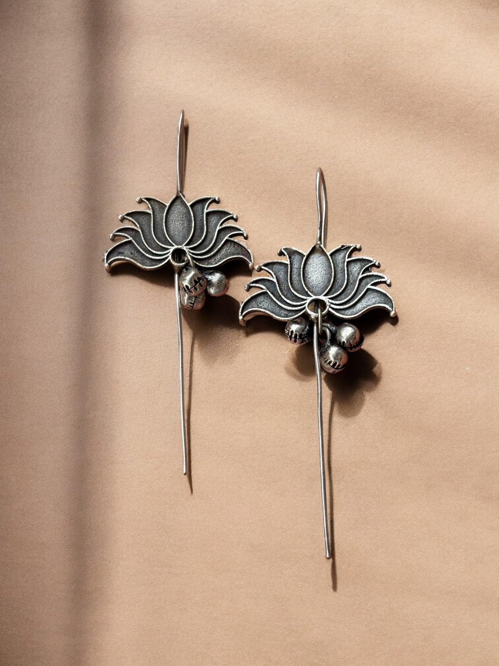 Design Inspiration: "Varija" — meaning lotus — is a symbol of purity, self-regeneration, and strength in Indian culture. The handcrafted petal design, paired with metallic ghungroos, pays homage to temple ornaments while the elongated pin-style hook evokes a minimalist, edgy elegance. A bold statement in stillness and motion. |